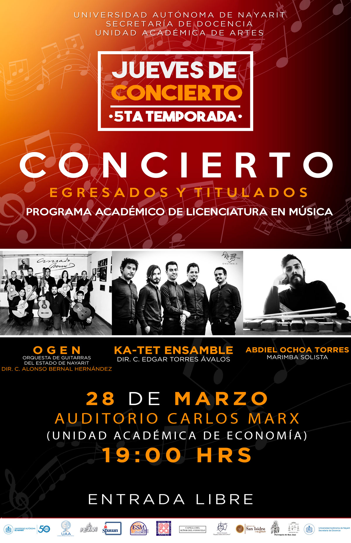 LA UNIVERSIDAD AUTÓNOMA DE NAYARIT, A TRAVÉS DE LA UNIDAD ACADÉMICA DE ARTES Y EL PROGRAMA ACADÉMICO DE LICENCIATURA EN MÚSICA, INVITAN A LA COMUNIDAD UNIVERSITARIA Y A LA SOCIEDAD EN GENERAL A DISFRUTAR DEL SÉPTIMO CONCIERTO DE LA QUINTA TEMPORADA DE "JUEVES DE CONCIERTO". ESTE EVENTO ESTARÁ A CARGO DE LOS ALUMNOS EGRESADOS Y TITULADOS DEL PROGRAMA ACADÉMICO DE LICENCIATURA EN MÚSICA . LA CITA ES ESTE JUEVES 28 DE MARZO EN EL AUDITORIO "CARLOS MARX" DE LA UNIDAD ACADÉMICA DE ECONOMÍA EN PUNTO DE LAS 19:00 HRS. ¡¡RECUERDA, LA ENTRADA ES LIBRE!!.